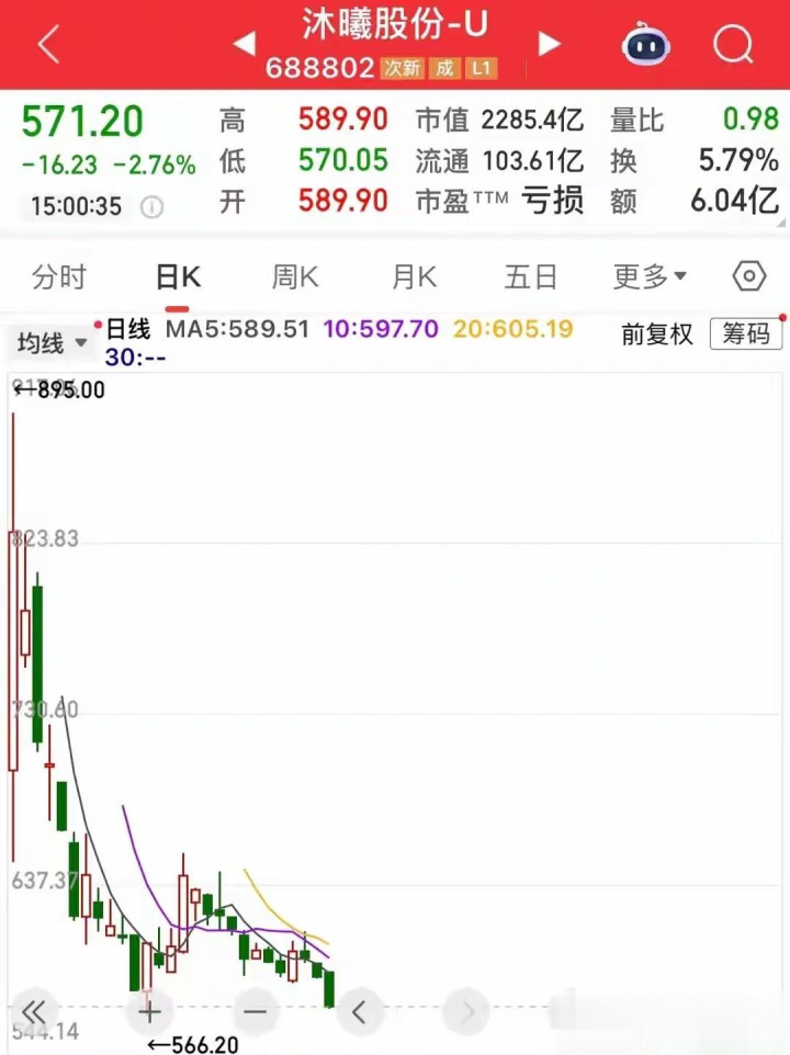 截至1月27日,沐曦股份股价已经连续6个交易日低于600元,最新报价571元。前期追高的投资者最多亏了36.5%,就算是中途想着抄底进场的,也没能幸免,多少都亏了些。没有盈利支撑,这样的股价让很多人觉得不切实际,毕竟就算对比同行业未盈利企业,这个估值也偏高。