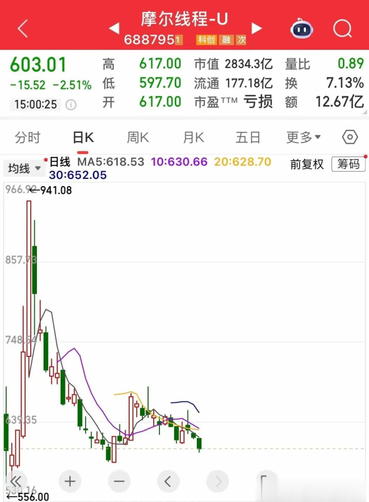 先看摩尔线程的现状,2025年预亏10.61亿元,虽然亏损比之前少了些,但自成立以来累计亏了62亿元,至今没赚过一分钱。2025年12月以114元发行价上市后,靠着市场热度连续涨了5天,股价冲到941元的高位,不少投资者追着进场想赚一笔。